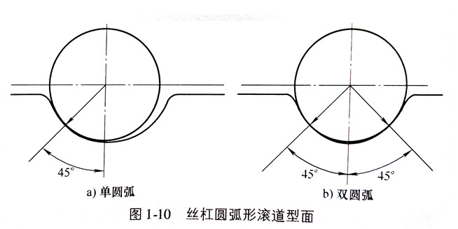 螺紋滾道型面是指通過滾珠中心作螺旋線的法截平面與絲桿、螺母螺紋滾道面的交線的形狀。這個型面也稱為螺紋法向截形。這個滾道型面的幾何形狀、尺寸以及材料的機(jī)械性質(zhì),對滾珠螺旋傳動的承載能力、摩擦特性、軸向剛度和軸隙調(diào)整均有較大影響。基于上述各因素的考慮,目前國內(nèi)應(yīng)用得最廣的滾道型面,有單圓弧形和雙圓弧形兩種。如圖1-10所示